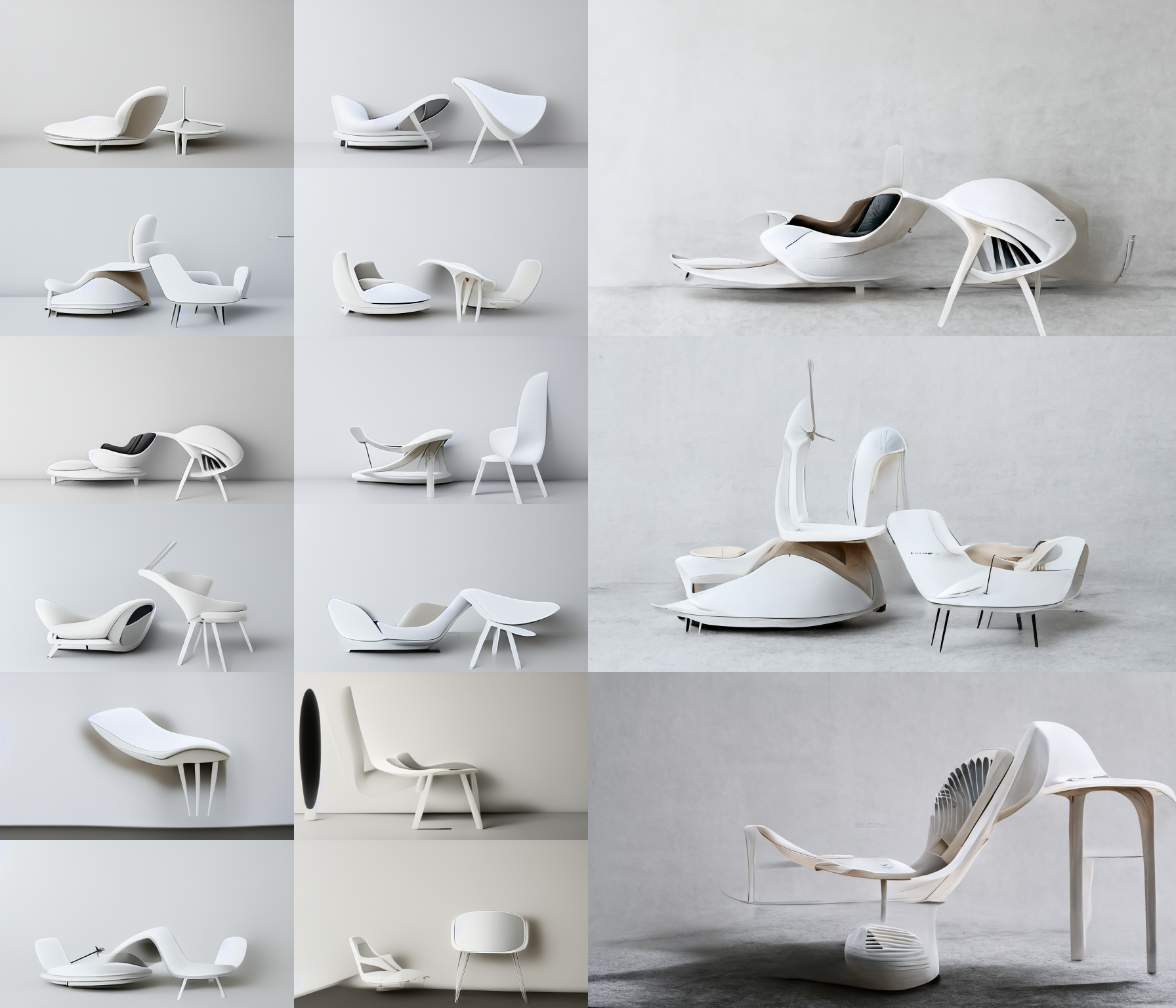 Initially, the text results of the probe were extracted as keywords and input into Midjourney, yielding various chairs with distinct shapes. Subsequently, the three most representative chairs were selected based on their appearance and style. Finally, their appearance was simulated to construct a three-dimensional 3D model, which became one of the primary elements in the final interaction design.