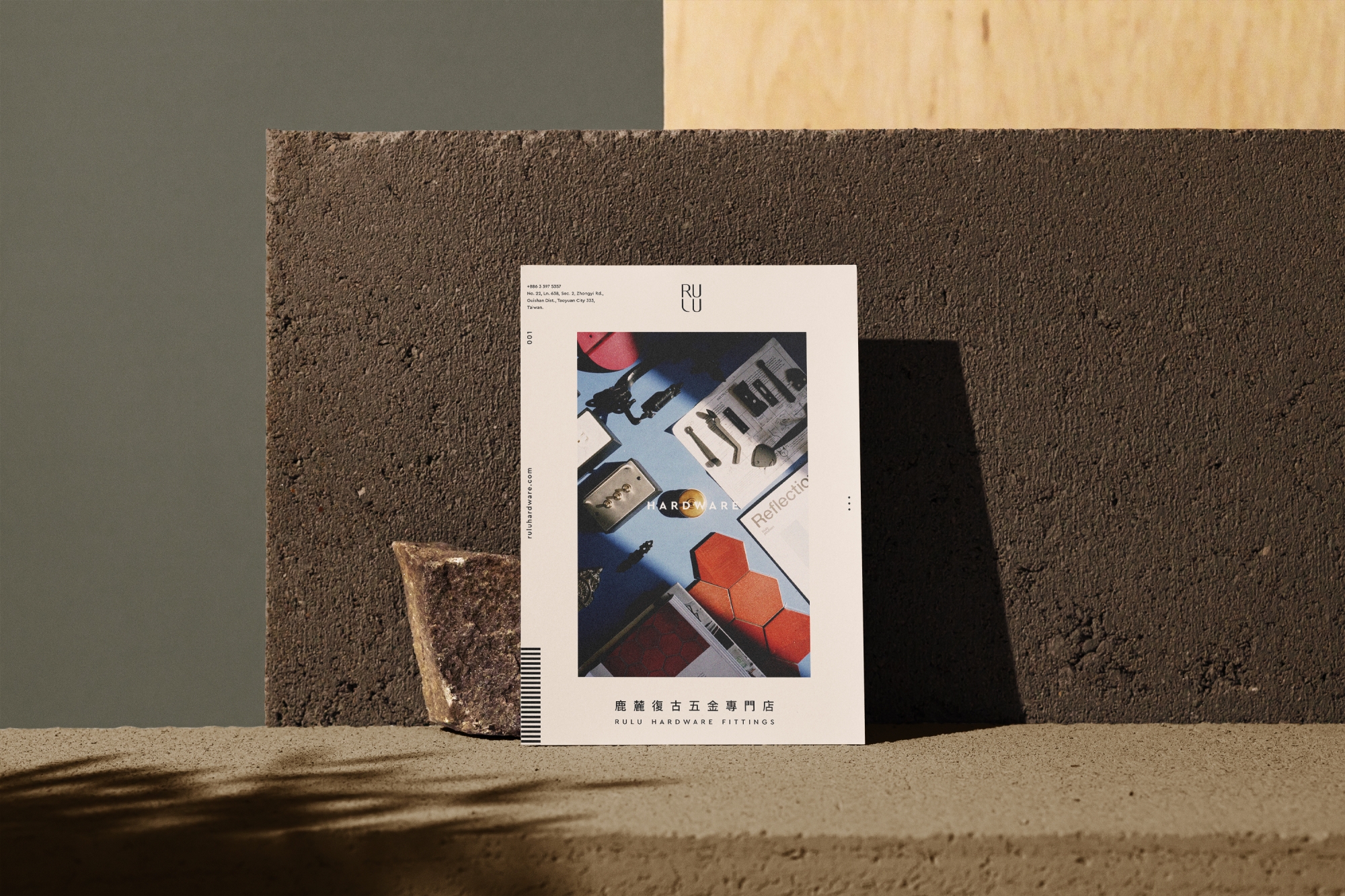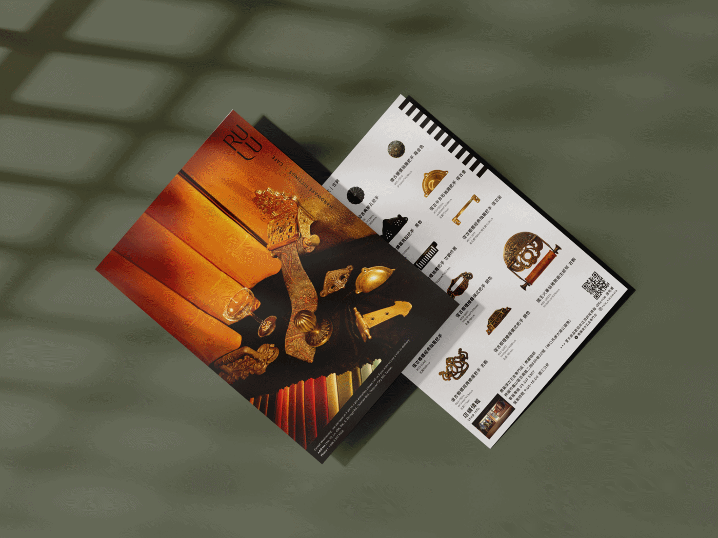 As the variety of items in the hardware store is vast, it is impractical to list them all. Hence, after discussing with RULU, we decided to feature 4 groups of the most representative hardware series, which consist of 67 pieces. These groups include the retro, switch, modern, and brass series. I created four fictional scenes with hardware as the key vision, which highlight their respective attributes. The front page is visually striking, while the back page provides detailed information about the products and the store. Furthermore, we also designed a drink menu with a similar style to promote the RULU cafe.